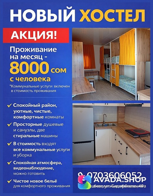 Удобства: Прачечная / laundry, Свободный интернет / free wi-fi, Телевизор / TV, Телефон /, Фен / hairdryer