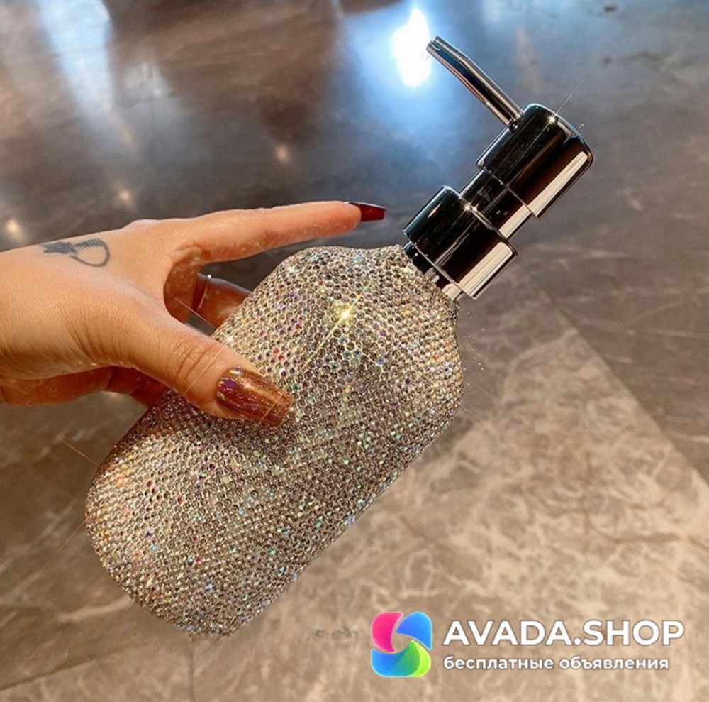 Бутылка с дозатором, очень стильная. усыпана камнями. подойдёт для жидкого мыла, для шампуней и т.д